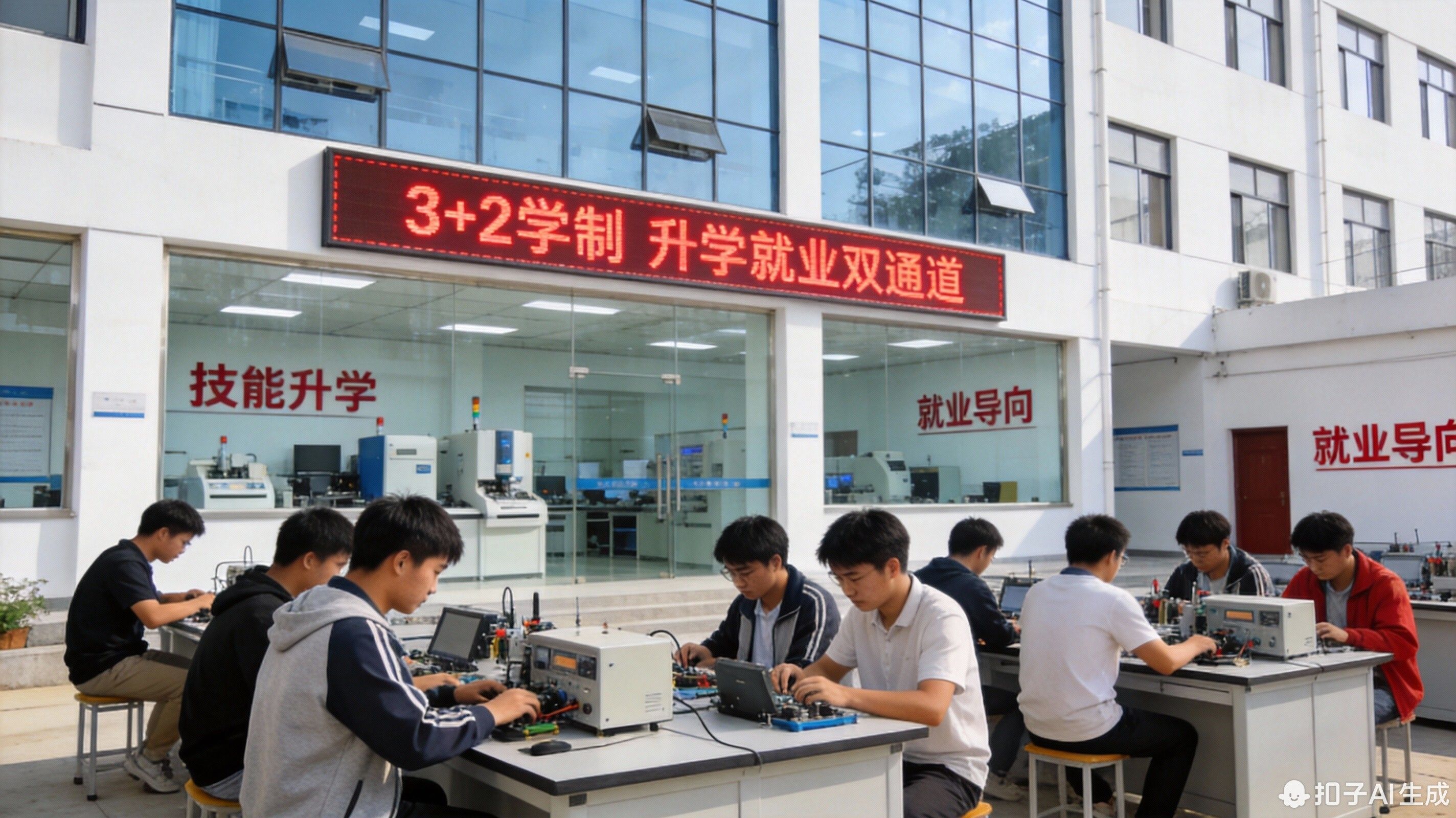 现代化中职校园,学生在实训室学习专业技能,为3+2贯通培养打下坚实基础