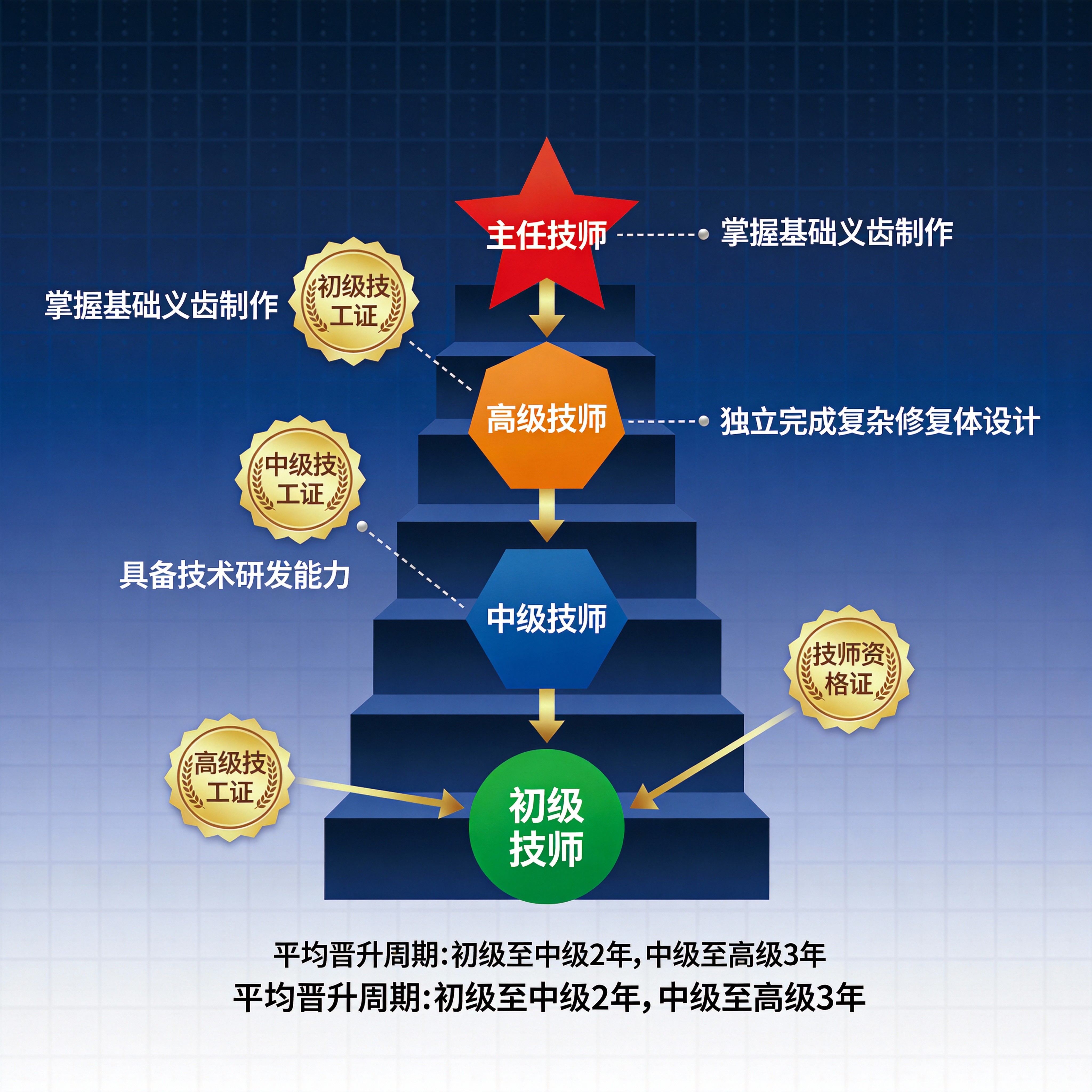 从在校期间考取初级证书,到毕业后考取中级证书;从普通技工到技术骨干;从技术能手到行业专家——口腔医学技术人员的发展道路清晰可见,晋升通道畅通无阻。