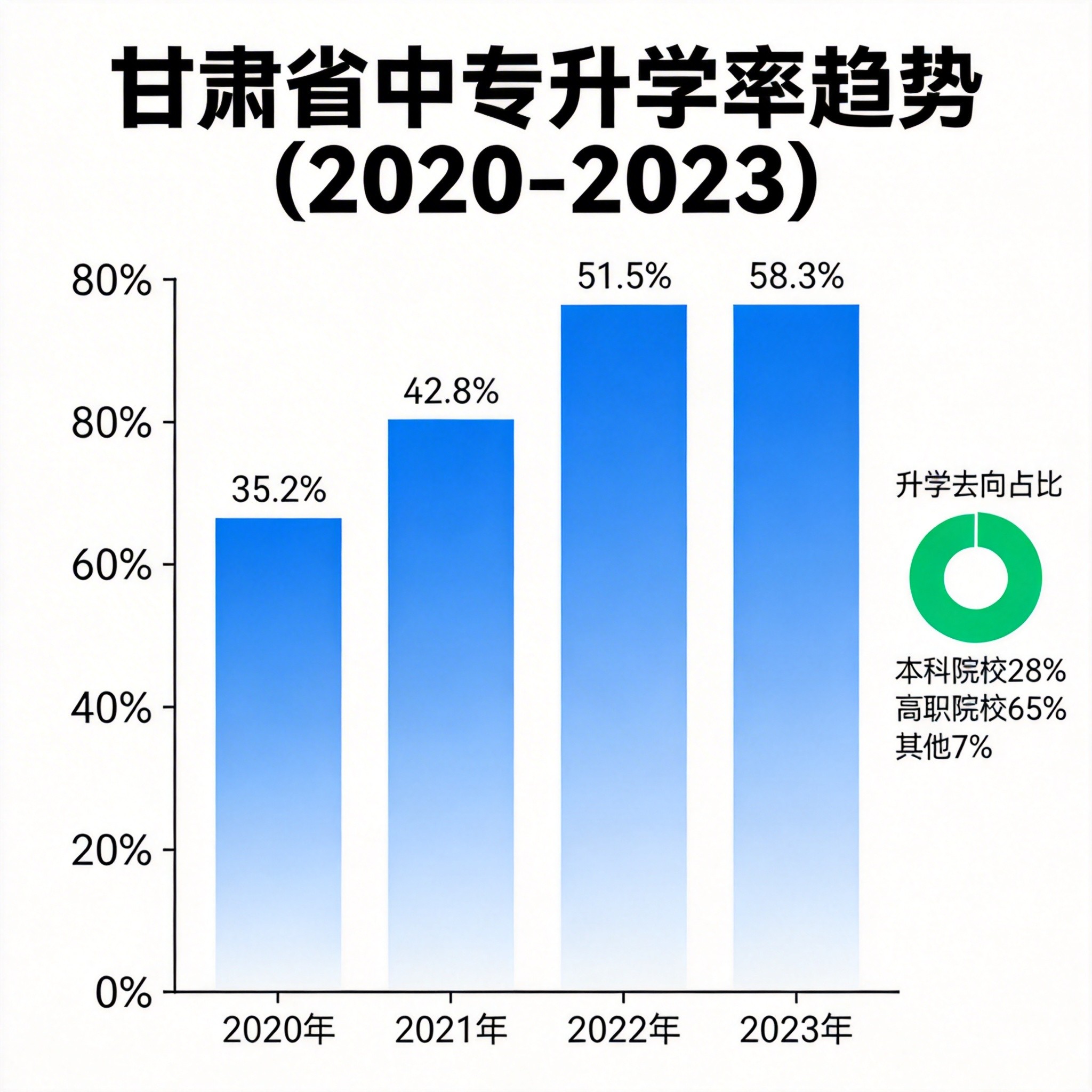 2025年甘肃省中职升学考试设置45个志愿,远多于普高志愿数量,大幅提高录取概率。