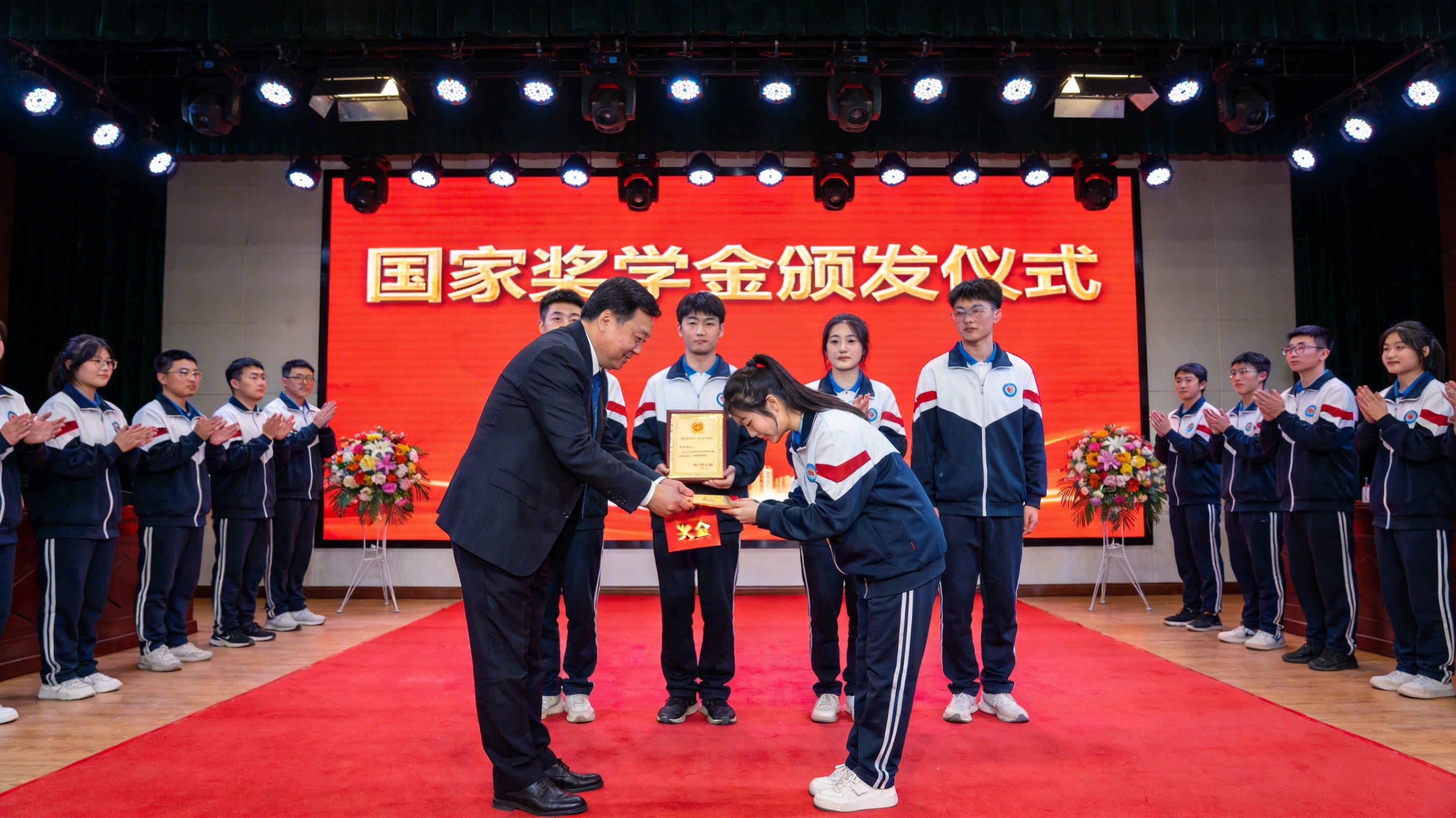 学校礼堂里,校长为优秀中专生颁发奖学金证书和奖金,体现了国家对优秀中专生的鼓励。