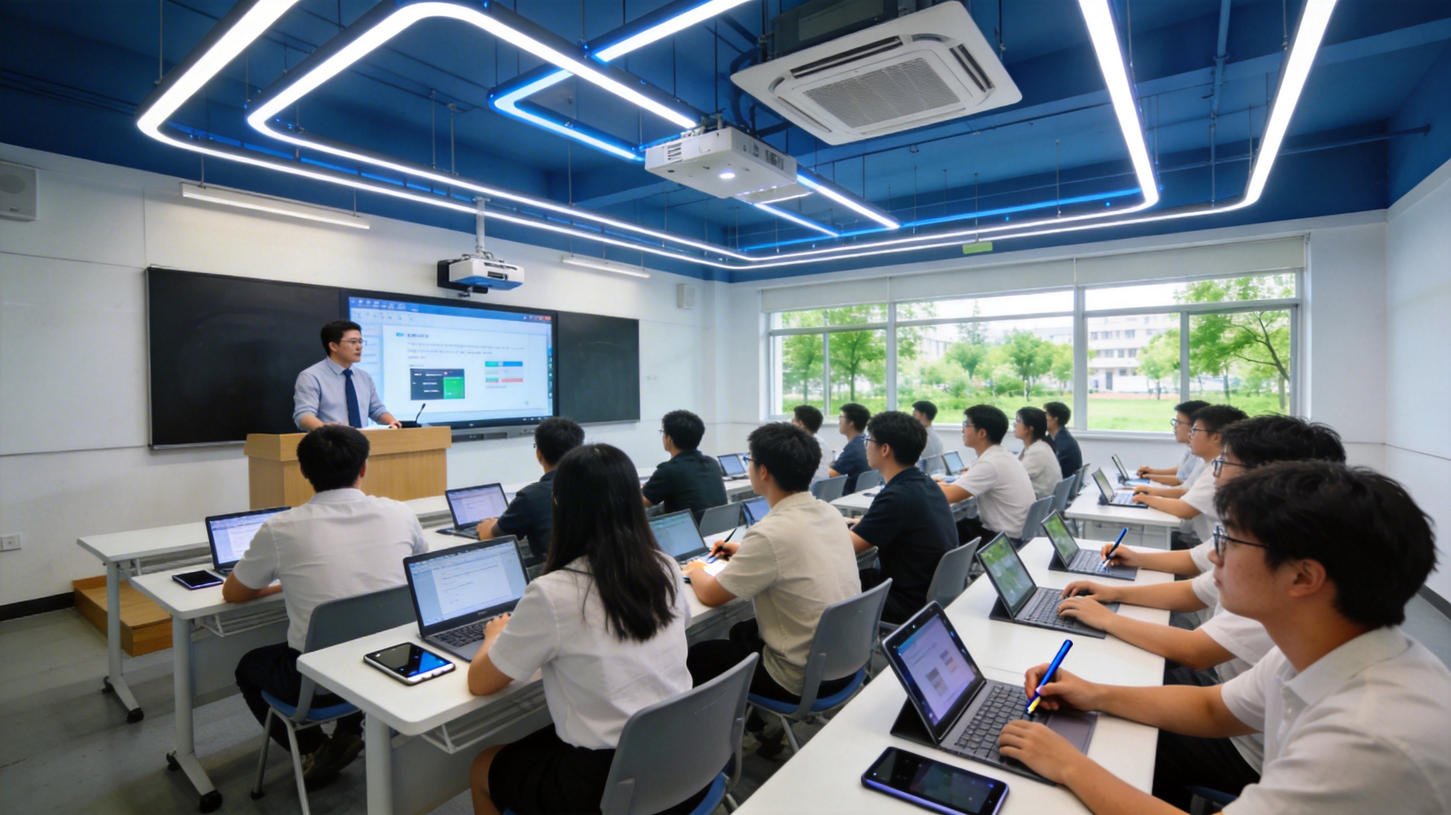 在现代化的多媒体教室里,学生们认真听老师讲课,体现了职业教育的现代化教学环境。