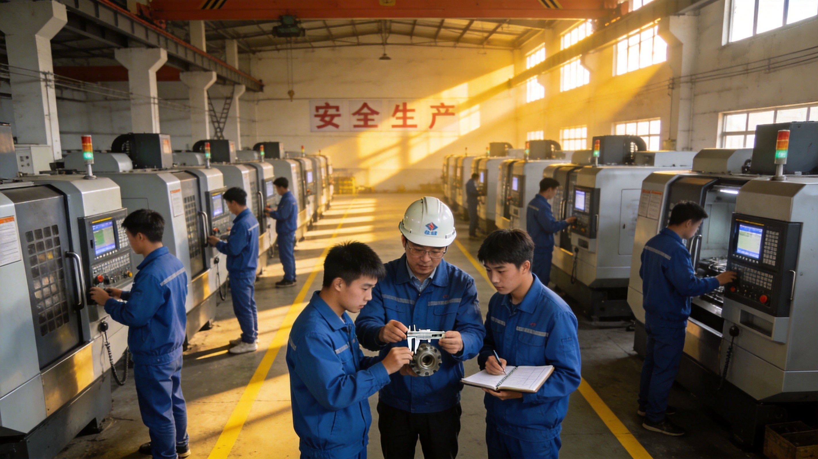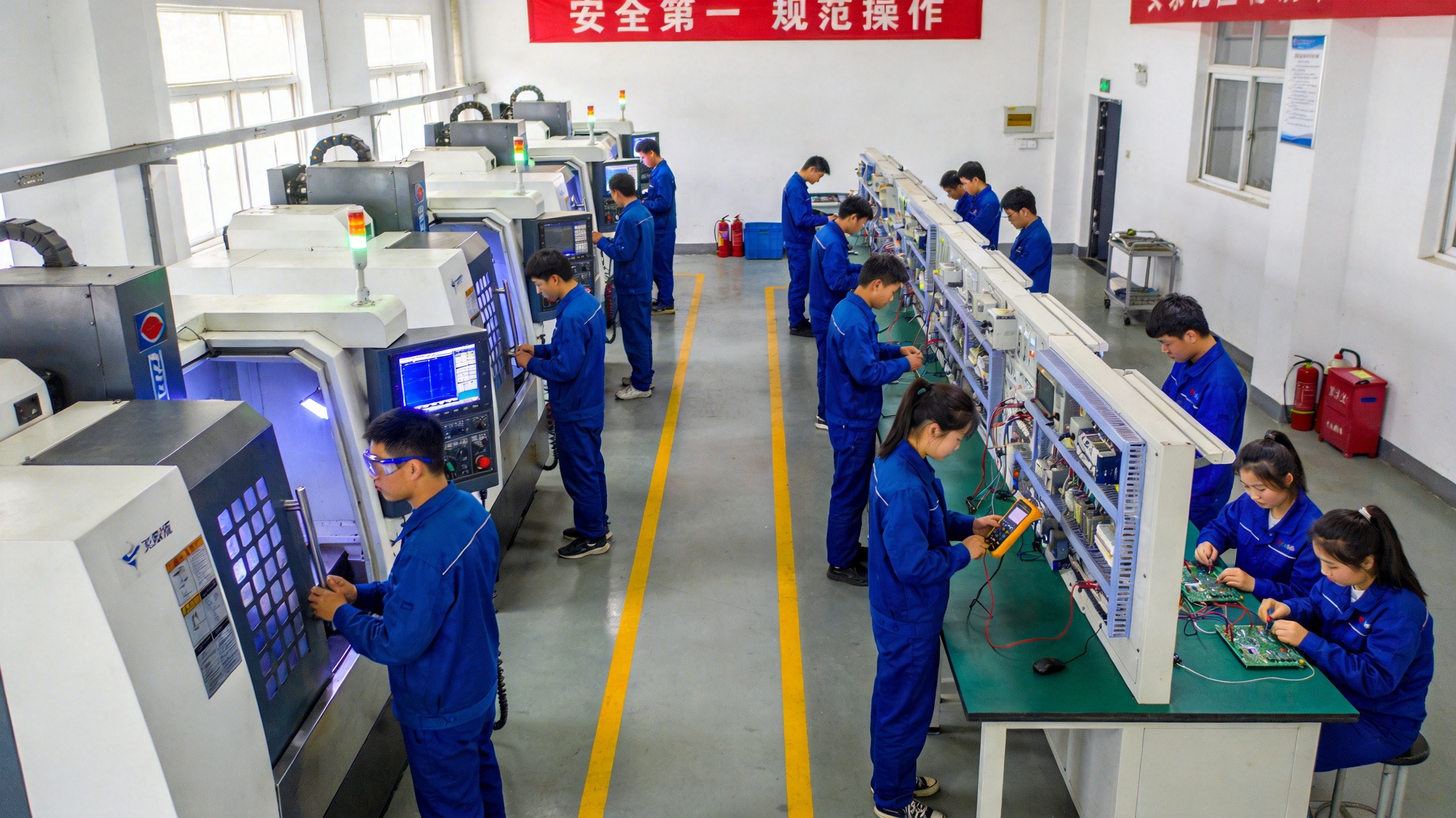 学生在现代化的实训车间里操作机床和电子设备,体现了职业教育的实践教学特色。