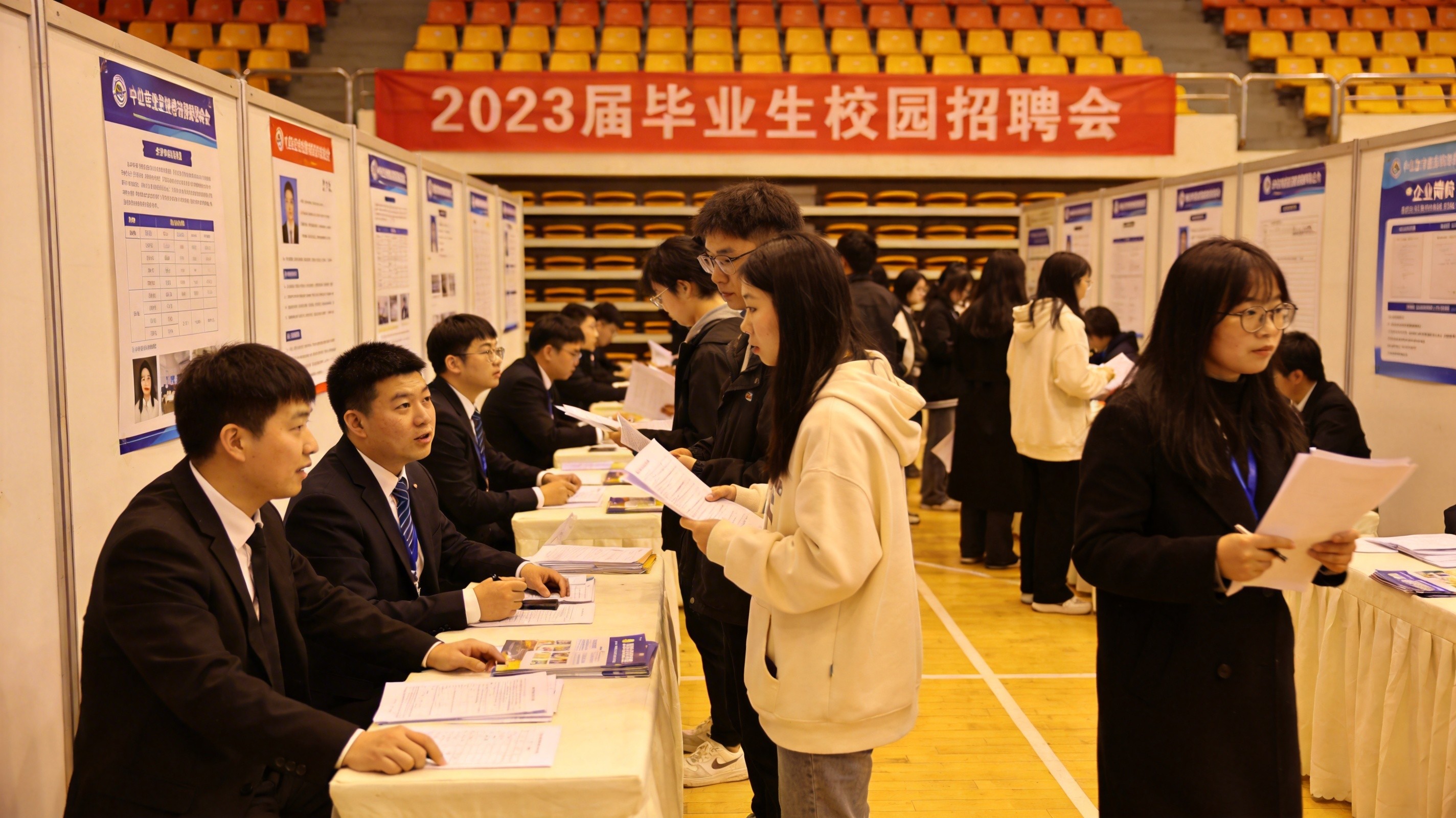 企业HR在学校招贤纳士,学生们排队投简历,体现了中专毕业生抢手的就业市场。