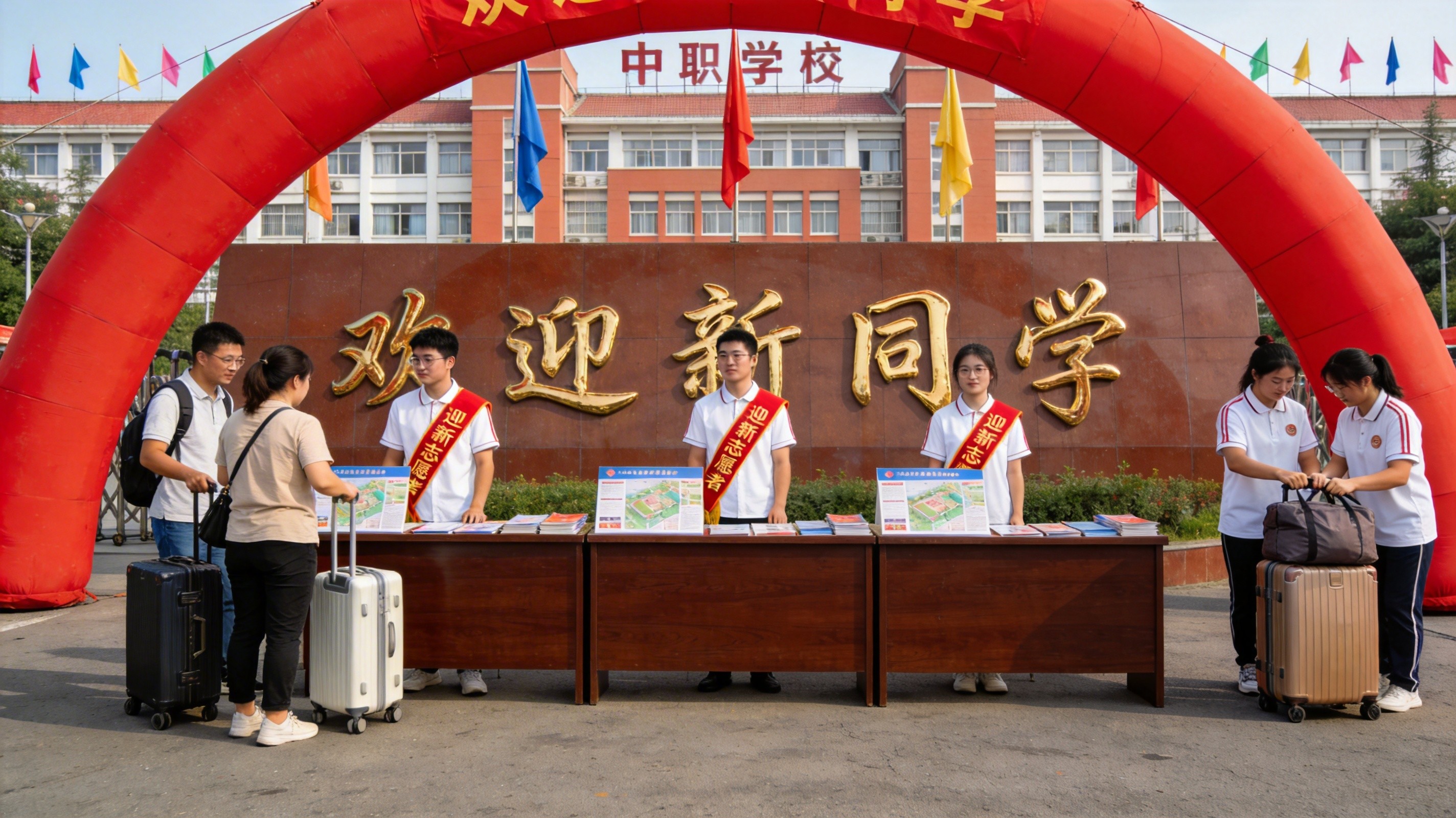 学校门口有欢迎新生的拱门,学生和家长拿着行李在咨询台前咨询,体现了新学期开学的温馨氛围。